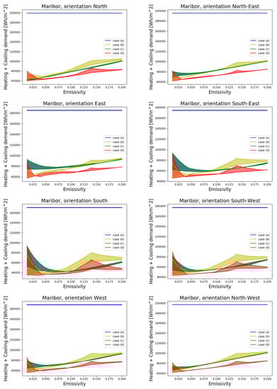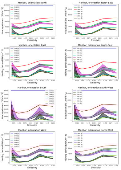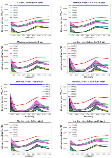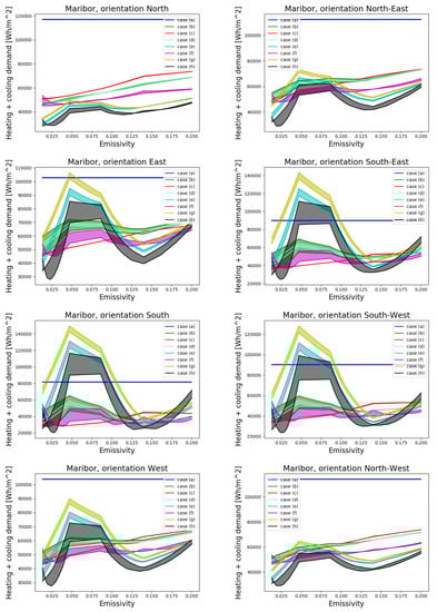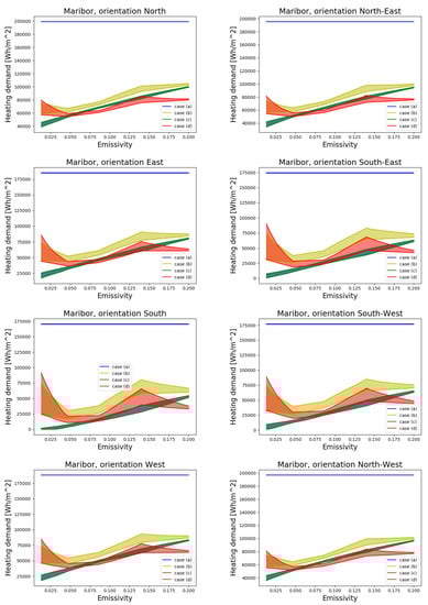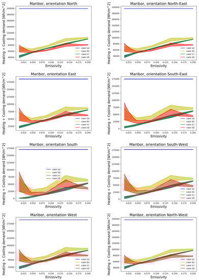 Figure 10, Figure 11 and Figure 12 and Figure 13, Figure 14 and Figure 15 show the heating demand and the sum of heating and cooling demand, for double and triple glazing for different orientations on buildings with very high impedance in Maribor. Meteorological data for Maribor (see Table 1) show that average temperatures are much higher compared to average temperatures at Kredarica. However, the heating season is still predominant. Average daily temperatures in Maribor also do not exceed 20 °C, but average daily maximum temperatures in June, July and August exceed 24.5 °C. Buildings with very low impedance (time constant less than 8 h) must be cooled during the hottest periods of the day. In addition, so-called heat waves are becoming more common, with daily maximum temperatures exceeding 30 °C for several days. Even buildings with moderate impedance must be cooled during these heat waves. Therefore, it is expected that low and moderate impedance buildings will have higher cooling requirements than predicted by the model, which best describes high impedance buildings. The results for glazing performance in Maribor are similar to those in Kredarica. For double glazing on a building with low solar gains, glazing with an outer pane of emissivity of 0.003 and an inner pane of clear glass gives the lowest sum of cooling and heating demand. Similar results are obtained for double glazing on a building with high solar gains and shading elements during the cooling period with a shading factor of 0.2. Nevertheless, if no shading is applied, it is better to use a pane with the lowest emissivity as the inner pane and clear glass as the outer pane (see Figure 14). For triple glazing on a building with high solar gains and without shading, overheating is much more evident for glazing with glass panes with a low-emissivity coating with emissivity values between 0.05 and 0.1. For east, southeast, south and southwest orientations, these overheating effects are so strong that these panes have the highest sum of heating and cooling demand. Although overheating can be regulated by using shading elements with a shading factor of 0.2 during the cooling season, it is better to use panes with a slightly lower emissivity of 0.025, which perform well in buildings with both low and high solar gains.