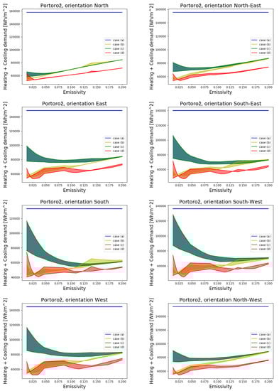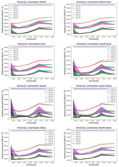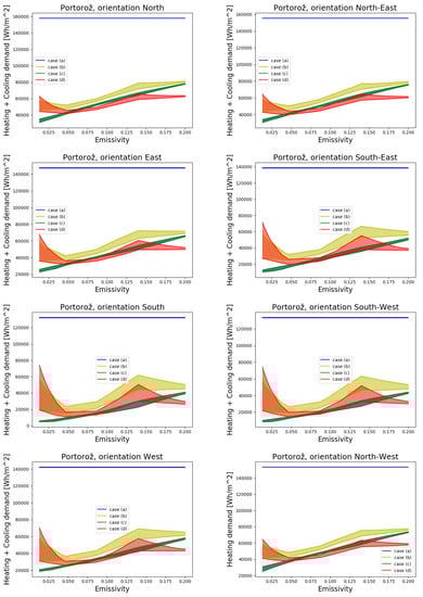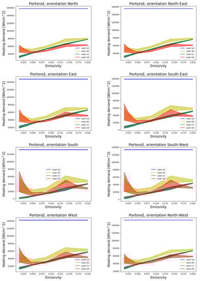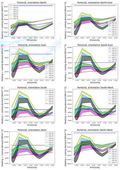 Portorož has higher monthly average temperatures than Maribor, but similar to Maribor, the heating season is predominant. The heating demand or the sum of heating and cooling demand for Portorož is shown in Figure 16, Figure 17 and Figure 18 and Figure 19, Figure 20 and Figure 21. Similar effects can be observed as in the case of Maribor, although on a larger scale. The only significant difference between Maribor and Portorož is that for double glazing on a building with high solar gains and no shading, glazing with an outer pane of clear glass and an inner pane with low-emissivity pane with emissivity value of about 0.03 achieves the lowest sum of heating and cooling demand (for Maribor, a low-emissivity pane with ten times lower value of emissivity is preferable).