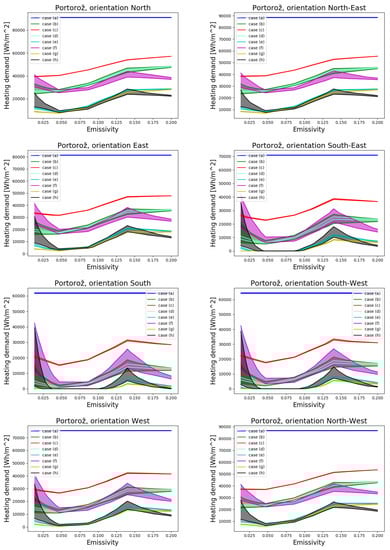 Annual heat loss per square meter of vertically set triple glazing system on object located at Portorož for high impedance building with high solar gains (well insulated or/and windows with large ratio of window area without shading during cooling season): (a) all panes with clear glass without low emissivity coating; (b) inner pane with low emissivity coating, other panes clear glass; (c) external pane with low emissivity coating, other panes clear glass; (d) middle pane with low emissivity coating, other panes clear glass; (e) inner pane clear glass, other panes with low emissivity coating; (f) external pane clear glass, other panes with low emissivity coating; (g) middle pane with clear glass, other panes with low emissivity coating; (h) all panes with low emissivity coating. As in case (a) there is no low-emissivity pane, the glazing has fixed emissivity and therefore the results do not vary with the emissivity. Different cases include low-emissivity glass with different values of reflectance.