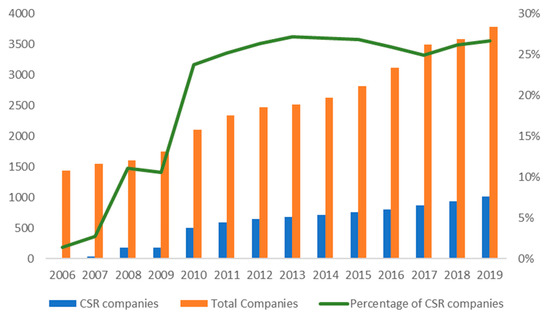 Our first research objects are the companies listed in the Shenzhen Stock Exchange and Shanghai Stock Exchange which published CSR reports from 2006 to 2019, and we label them as CSR companies. We assumed that companies which did not publish CSR reports did not engage in CSR activity. Though it is possible that some companies have conducted CSR projects but have not disclosed them, we do not think this possibility will cause a big problem. Since CSR is good for reputation, firms must want to let the public know. Therefore, such a possibility should be in a transitioning state and should not relate to too many companies. Basically, the total number of CSR activities represents a company’s effort in following CSR regulations, while the number of environmental protection measures represents a company’s effort in reducing its carbon emissions and pollution. We collected companies’ annual financial report and CSR report data from the China Stock Market & Accounting Research (CSMAR) database from 2006 to 2019. Table 1 shows the variable definitions.