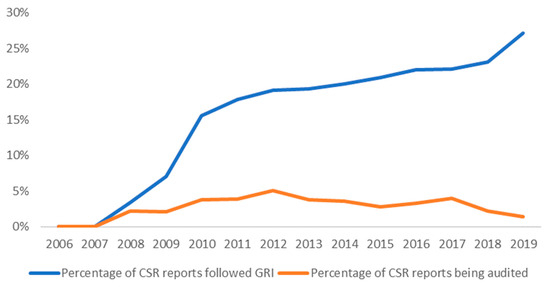 First, we show the development of CSR disclosure in China. Figure 1 demonstrates how CSR grew from 2006 to 2019. We found a fast CSR disclosure growth from 2006 to 2010, and then it stayed at around 25% of the total companies listed. The fast early growth is associated with CSR regulation and mandatory CSR disclosure. The slow growth from 2010 may indicate that companies lacked incentives to launch CSR projects or adopt CSR disclosure systems. Figure 2 shows the quality of CSR disclosure in China. We found that the percentage of CSR reports following the Global Reporting Initiative Standard (GRI) increased over the years but was still below 30% in 2019. Furthermore, the percentage of CSR reports being audited by a third party was under 5% during most of the studied time period.