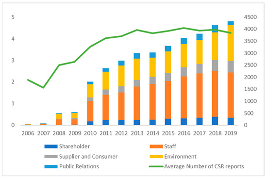 Second, we present the types of CSR projects of CSR disclosure activities from 2006 to 2019. Figure 3 shows a clear growth trend in the total number of CSR projects disclosed, with staff protection and environment protection projects being the most reported types. However, the average number of CSR projects disclosed per report stayed at around 4.5 from 2013 to 2019. This indicates that the growing number of total CSR projects is due to the growing number of CSR companies.