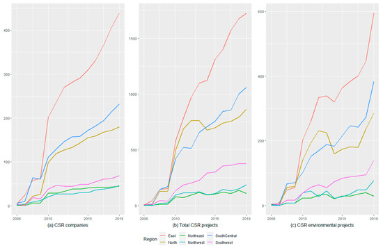 Regional CSR development: (a) number of CSR companies; (b) total number of CSR projects disclosed; (c) number of CSR environmental projects disclosed.