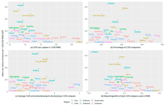 Finally, we explain the connections between company CSR behavior and regional carbon emission trends. According to some theoretical studies, more CSR will result in less carbon emissions [3], which is the relation we want to explore. Figure 5 shows how the provinces are posited according to their carbon emission efficiency (metric tons per million RMB GDP) with regard to four indicators: (a) GDP per capita, (b) percentage of CSR companies, (c) average CSR environmental projects disclosed per CSR company and (d) natural logarithm of total CSR company assets (RMB) in 2017. We found that most provinces are more likely to cluster in their regions. Richer provinces with a higher GDP per capita are more likely to have lower carbon emissions per unit. Some provinces might have higher percentages of CSR companies and more CSR environmental disclosure, but their carbon emission efficiency is not necessarily higher. Furthermore, Beijing, Shanghai and Guangdong, which represent the economic centers of the north, east and south-central regions, respectively, have the highest numbers of total CSR company assets. The fact that the best carbon emission efficiency was found in these three provinces is probably because their CSR companies are much larger than those in other provinces.