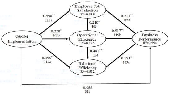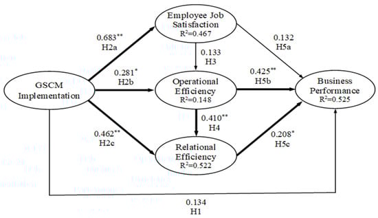 This research examined the relationship between the implementation of GSCM practice and job satisfaction as well as two different types of efficiency. Then, the relationship between the above-mentioned factors and business performance was evaluated. Table 5 and Figure 3 and Figure 4 present the results of the structural model estimation.