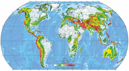 Seismic regions of the world (Source: Global Seismic Hazard Assessment Program, http://static.seismo.ethz.ch/GSHAP/global/, accessed on 5 September 2021).