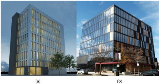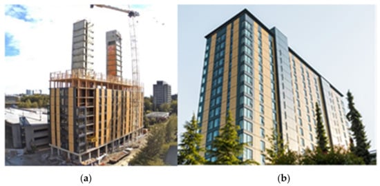 UBC Brock Commons, during construction (a) and after completion (b).