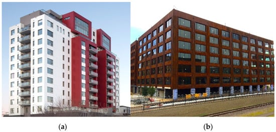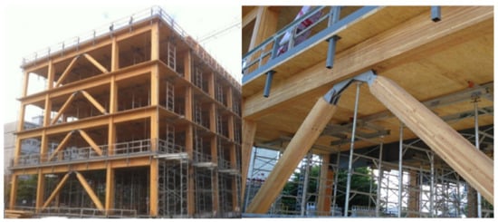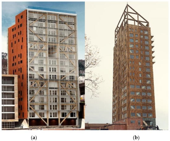 First, the 14-story “Treet” Apartment building in Bergen, Norway (Figure 9) was the tallest wood building in the world when it was completed in 2015 [17,18]. The building has a number of innovative features developed through research for particular application in this building, and the completed building demonstrates the feasibility of those in a practical building of that height range. There are load-carrying glulam trusses and two intermediate strengthened levels to support prefabricated building modules above a concrete garage. The structure also includes innovative glulam-braced frames as part of a lateral force resisting system designed primarily for wind loads. CLT panels are used in the elevator shaft and interior walls, but the main load bearing system does not rely on their contribution.