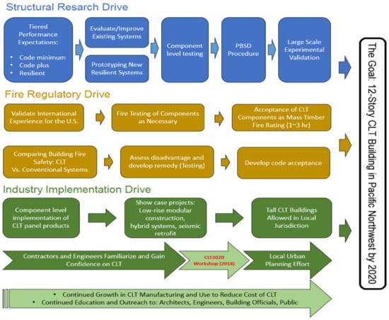 Roadmap for tall CLT buildings in the USA (Source: NEHRI Tall Wood, http://neesclt.mines.edu/index.html, accessed on 5 September 2021).