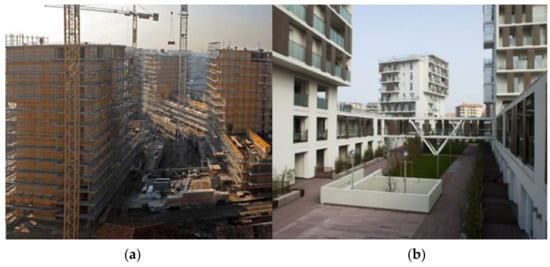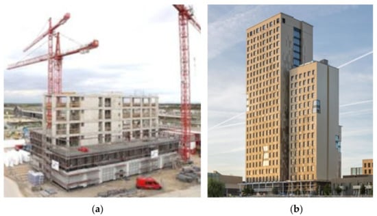 HoHo Tower, Vienna, Austria during construction (a) and completed (b) (Photo in public domain).