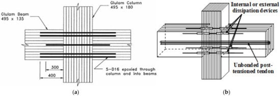 Moment connections with epoxied threaded rods embedded inside glulam beam–column joints (Figure 15) were proposed and tested in New Zealand in the early 1990s. The results showed significant ductility in the connections achieved through the yielding of the materials. A similar arrangement with the addition of unbonded post-tensioning (Figure 15) was developed at the University of Canterbury, Christchurch in the mid-2000s. Ductility is achieved mostly through the yielding of internal or external mild steel energy dissipators (Figure 16) during the rocking motion of the connections when subjected to lateral loads. Post-tensioning provides a re-centering ability to the connection in addition to contributions in moment capacity.
