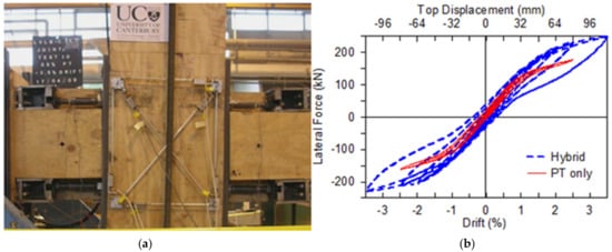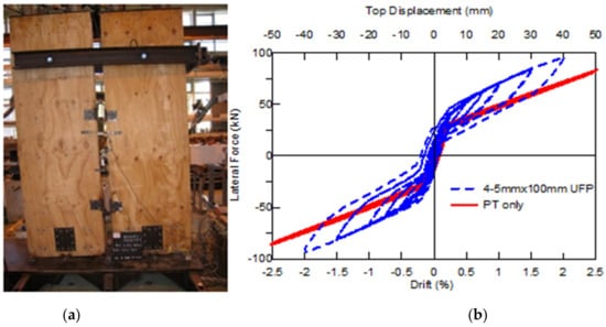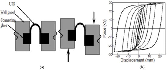 The concept is not limited to beam–column joints only; it is applicable to similar connections and members in general. Other types of energy-dissipating elements, also made of mild steel, have been used in different connections and systems. One of those includes U-shaped Flexural Plates (UFP) in vertical plane between adjacent shear wall panels (Figure 17). As the panel resists in-plane lateral loads, there is relative displacement between the two ends and energy is dissipated due of yielding of the plates [24]. It is to be noted that the UFPs show uniform and stable hysteretic behavior under repeated loading in alternating directions. Similar to beam–column joints, post-tensioned shear walls with UFPs (Figure 18) exhibit a self-centering ability in addition to significant energy dissipation.