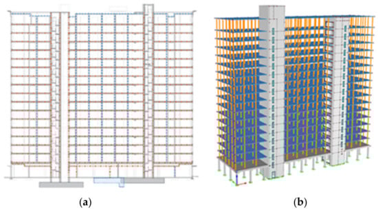 Building section (a) and structure with cores (b).