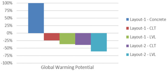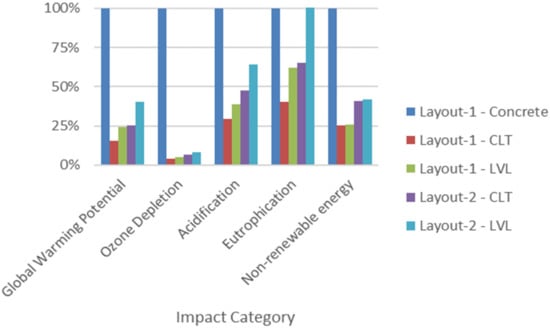 The cradle-to-gate environmental impacts for each category and each layout are listed in Figure 22. The quantities are given in an equivalent unit. For example, kilograms of carbon dioxide are used as an equivalent unit to measure global warming potential. Figure 23 illustrates the difference in impacts for each layout using the existing building as a baseline. That is, Layout 1 concrete has 100% impact for all categories.