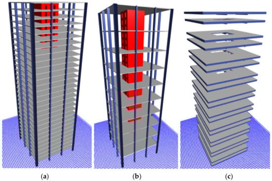 A concrete (Figure 24a) and a hybrid building (Figure 24b,c) were investigated to compare their LLRS and the material amount required to meet structural demands of Part 4 of NBCC (2015). The buildings were designed for Vancouver, BC using the data from NBCC 2015. Both the concrete and hybrid buildings had plan dimensions of 27 m × 27 m with 30 3-m-tall stories for a total building height of 90 m. The structural system for the concrete building consists of perimeter gravity columns that support a flat plate slab system and a center elevator/stairwell core that supports the slab and resists the lateral wind and seismic loads. The hybrid buildings eliminated two out of every three flat plate slab systems and implemented the glulam beam and CLT floor system. This system carried the gravity loads and transferred them to the perimeter concrete columns and the center concrete core similar to the flat plate slab. The façade and foundation design were not part of this projects’ scope. Two different glulam beam and CLT floor systems are compared for the hybrid building. One system with a 4.5 m on-center beam layout with one-way spanning CLT panel system and one with a 3-m on-center beam layout with two-way spanning CLT panels.