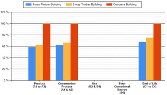 Global warming potential by life cycle stage, normalized to concrete building.