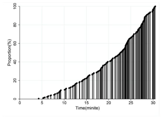 According to the threshold for the traffic time as outlined above, typical times for the traffic circles in Northeast China have been identified. For the 15-min living circle, 55 pairs of cities meet the threshold, accounting for just 0.15% of the total number of cities; this indicates that relatively few cities and towns are able to support the social activities that are necessary to sustain the daily lives of city dwellers. There were 221 pairs of cities and towns satisfying the 30-min commuting circle, representing a relatively low proportion of 0.6% of the total number of cities; this commuting circle is the focus of research. There were 883 pairs of cities and towns that met the 60-min commuting circle, accounting for 2.4% of the total number of cities. The distribution of town pairs meeting the 30-min threshold was uneven. The pairs of towns were more concentrated between 15 and 30 min; especially between 23 and 30 min, the proportion reached the highest value of 46.2%. The proportion of town pairs between 25 and 30 min was also high, reaching 32.1%, and the proportion of town pairs between 20 and 25 min reached 26.7%, accounting for 58.8% of the total. The details are shown in Figure 1.
