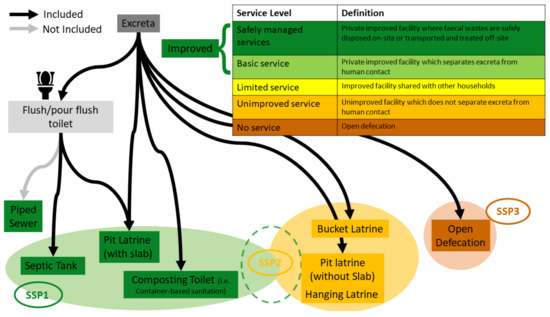 Decentralized (on-site) sanitation technologies are the focus of this assessment as they are generally the most scalable, effective and equitable adaptation measure within the sanitation sector and are typically the first accessible improved sanitation option for those that currently have no access to sanitation [2,13]. They have a lower economic burden on the household user [14,15], some forms have been proven to be effective in reducing negative climate impacts [16,17,18,19], and most importantly, they can provide access to improved sanitation for the most vulnerable populations [13,15,17]. Specifically, this assessment focused on the three different service levels of sanitation (i.e., improved, unimproved and no service), as defined by the Joint Monitoring Programme (JMP) [20], as they pertain to three Shared Socioeconomic Pathways (SSPs), as described in the framework presented by O’Neill et al. (2014). Many of the most resource-constrained populations are still facing major sanitation challenges, including widespread open defecation; as such, the climate impacts of the elimination of open defecation is the main focus of this assessment.