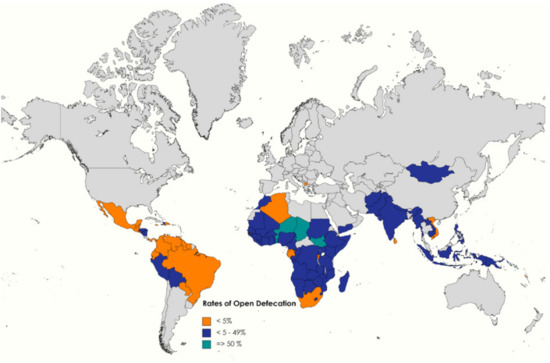 As with most community-based data collection, despite rigorous procedures to produce reliable data, inaccuracies can occur. For example, there is known open defecation that has not been reported on or included in the data available from the JMP database. This is apparent in many high-income countries that claim a total eradication of open defecation, such as in Canada, where the federal government estimates that there are approximately five thousand homes in rural and primarily indigenous communities that lack access to basic water and sewage [54]. However, it should be noted that this type of data is hard to come across, and analyses such as this must rely on sources such as Multiple Indicator Cluster Surveys (MICS), Living Standards Measurement Study (LSMS), and Demographic and Health Surveys (DHS) [55,56]. Additionally, many sources like nationwide household surveys rely on self-reported data with inherent biases. There can be stigma associated with admitting to openly defecating, and therefore it is likely under-reported [57]. Although this would have a comparatively small impact to the totals obtained in this analysis, it is worth mentioning that there is room for improvement in robustness and clarity in the included country dataset, should this analysis continue to be used and enhanced in the future.