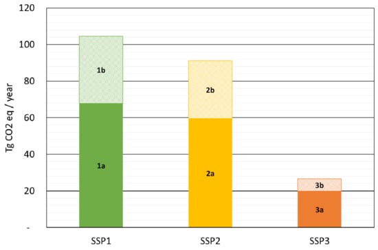 Results were characterized by variability between SSP scenarios, with SSP3 producing estimations significantly lower than SSP1 and SSP2. For the 100-year GWP, the results ranged from 68 Tg CO2eq/year (SSP1—Scenario 1a) to 7 TgCO2eq/year (SSP3—Scenario 3b) in 2030. Figure 3 depicts the results of each SSP scenario with SSP1 representing best-case, SSP2 characterizing status-quo and SSP3 describing worst-case scenarios, respectively.