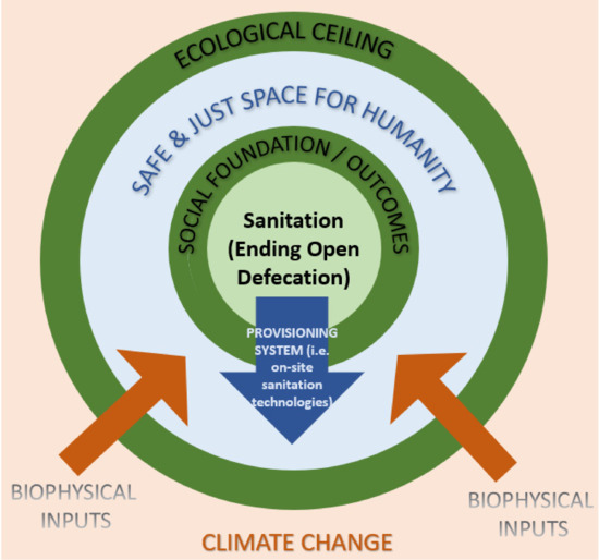It is clear that in order to eliminate open defecation using improved and accessible forms of on-site sanitation, total GHG emissions will increase from current levels in both SSP2 (status-quo) and SSP1 (best-case) scenarios. However, it is important to contextualize this through the lens of what it means to achieve sustainable development; as Kate Raworth stated in her book “Doughnut Economics”, the goal is to arrive and stay in a “safe and just space for humanity” [44]. This space, in the context of sanitation, is one where every person’s basic needs are met while at the same time safeguarding the natural world on which humanity depends (i.e., there will always be a balance between transgressing biophysical boundaries and achieving high social thresholds) [44,45]. For example, in scenario 1b, which is the best-case scenario where open defecation is eliminated by 2030 using only improved forms of sanitation, a total of 37 Tg CO2eq/year in 2030 is yielded, which is only 0.2% of total global anthropogenic CO2 emissions [46] and only 3% of total global emissions from wastewater [46,47]. Although emissions will likely increase, they are comparatively very small and will allow for the elimination of open defecation through the means of on-site sanitation (a basic human right) [9]. This analysis was based on the theory that empirical evidence exists that satisfying a basic need, such as ending open defection, is a precondition for well-being, which in turn can help propel the global population into an area that meets climate goals and maintains natural boundaries, and this is supported by the results obtained. This study provides evidence that on-site sanitation systems are a solution that is in-line with the Living Well Within Limits (LiLi) analytic framework [48] developed by Dr. Julia Steinberger and colleagues, whereby these technologies are a type of provisioning system that links biophysical resource use and social outcomes (Figure 5).