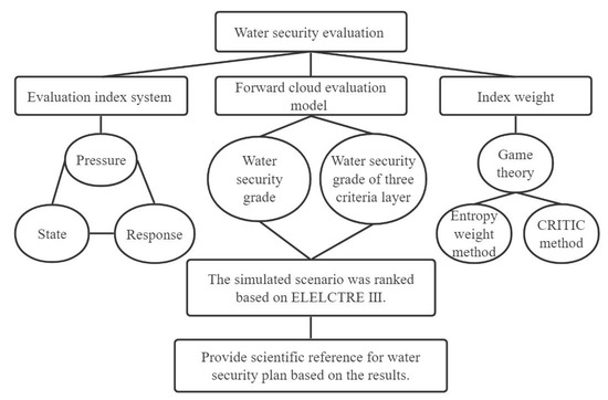 This study presents a comprehensive index system for evaluating water security based on the pressure-state-response (PSR) model. The index weights were calculated using the combination method of game theory (GT), which combines an entropic method with a criteria importance through the inter-criteria correlation (CRITIC) method. The grades of water security in the CBSR between 2014 and 2019 were calculated based on the forward cloud model (FCM). Then, the average values of the indices were used as the sample scenario. Finally, the ELECTRE III model was used to rank the simulated scenarios to obtain the optimal simulated scenario. The research framework is shown in Figure 1.