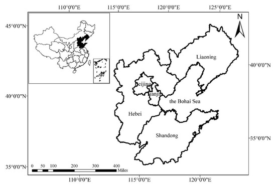 The Circum-Bohai Sea Region (Figure 2) refers broadly to the three provinces and two cities around the Bohai Bay, including Beijing, Tianjin, Hebei, Shandong, and Liaoning. This region is located in the center of the Northeast Asian economic circle and is known as the third growth pole of China’s economy [11]. It is an important agricultural base and represents the largest industry-intensive area in China. However, while implementing economic development plans in the CBSR, water security problems, including the shortage of surface water resources and the uneven distribution of time and space on water, have become increasingly prominent. Excessive exploitation of groundwater also causes frequent secondary disasters. Simultaneously, the water environment is seriously polluted and the water ecology is degraded. At the governmental level, water resource management functions are divided into several branches, making it difficult to solve the relevant problems effectively [12]. Therefore, water security has become a critical factor to consider in the process of planning projects concerning water resource management and protection in the CBSR.