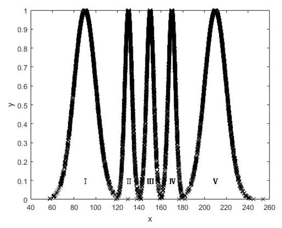 The characteristics of the cloud model include expectation (EX), entropy (EN), and hyper entropy (HE), where EX represents the cloud droplet as a qualitative concept in the domain space, EN represents the acceptable degree of the cloud droplets in the domain space, and HE is the entropy of entropy, which represents the uncertainty of entropy and the degree of cloud droplet condensation in the domain space. These parameters (Table 4) can be calculated using the expressions in Equation (16) [22],