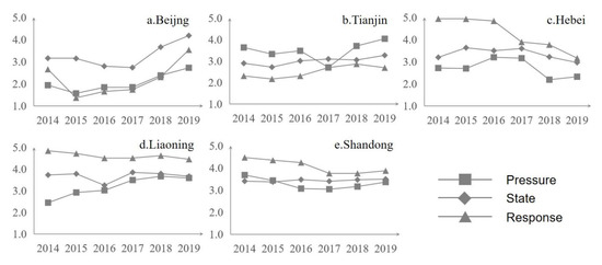 It is clear from Figure 5 that the security capacity of the state-layer (SL) in Beijing was the worst, and its grade fell between generally safe and unsafe. In contrast, that of the pressure-layer (PL) and response-layer (RL) were relatively safer, i.e., between the very safe and generally safe grades. As the capital city, Beijing is relatively more advanced and more developed in all aspects, so it has also attracted a large number of people. However, the small amount of total water resources exacerbates the water shortage problem in the case of a dense population. Therefore, water conservancy projects and water diversion projects must be implemented in order to increase the water supply to meet the water demand; however, this exerts a significant amount of pressure on the water supply security. Simultaneously, Beijing’s groundwater resources are exploited, thus seriously affecting the water ecology. Although there are issues regarding the use and supply of water resources, the cost of water has decreased thanks to economic and technological support and development, and the efficiency of water use has also improved significantly. In addition, urbanization developments and adjustments of the industrial structure have helped to enhance the city’s water security capacity. However, the construction of drainage networks still presents a problem because they are prone to waterlogging during the rainy season.