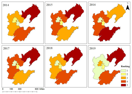 Table 8 reflects the time variation trend of water security grades of the study area, and the spatial distribution analysis can be shown in Figure 5.