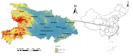 Geodata: Geodata such as DEM come from the 1:4,000,000 databases of China’s National Basic Geographic Information System (http://nfgis.nsdi.gov.cn, access 24 October 2021). This type of data is mainly used to characterize the topographic information of the three regions in the east, middle, and west of Hubei Province and to analyze the regional differences in terms of coupling and coordination.