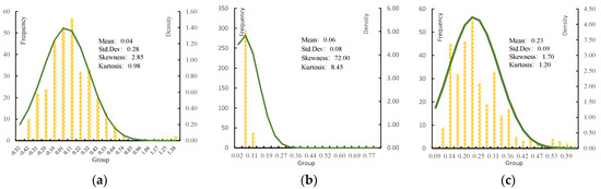 Figure 2b shows that the growth rate of the GTFU function transition in Hubei Province is highly concentrated and is mainly clustered between 0.02 and 0.11, with a skewness coefficient as high as 72. A few cities have higher growth rates and fewer outliers. Nevertheless, the difference is significant, resulting in the density curve showing “sharp peak and fat tail” characteristics. The functional transition mainly reflects the changes in the production, life, and ecological functions of farmland. The high degree of agglomeration indicates that the use of farmland in various regions of Hubei Province is showing a solid balance, which is inseparable from the implementation of agricultural policies and the extensive use of science and technology.