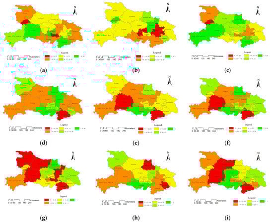 (3) Model transition: The model transition change rate mainly reflects environmental friendliness, technological level, space utilization, and resource conservation in terms of farmland use. In this regard, there are apparent differences between the eastern and western parts of Hubei Province (Figure 3g–i). The model transition index of the eastern region is in a state of continuous growth, which may be close to Wuhan and the development of Wuhan urban agglomeration. Affected by the radiation of Wuhan’s science and technology, talents, capital, the industrial layout of the eastern cities has been optimized, agricultural tourism has developed rapidly, and the level of agricultural technology and the ecological environment has been improved. The continuous deterioration of the functional transition of farmland in the western region is related to precipitation. This part of the province is mostly mountainous and hilly, making it not suitable for the large-scale promotion of agricultural technology. However, there may be more reasons for the continuing deterioration that need to be further explored.