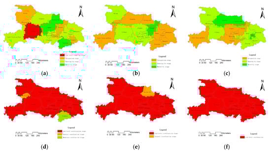 The coupling, coordination results for 2000, 2010, and 2019. (a) Coupling 2000; (b) coupling 2010; (c) coupling 2019; (d) coordination 2000; (e) coordination 2010; (f) coordination 2019.