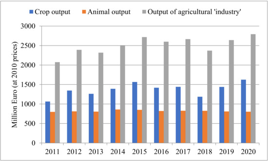 Lithuanian agriculture has experienced a shift towards crop production (as opposed to animal production). Figure 1 presents the trends in the crop and animal output of Lithuanian agriculture (EUROSTAT defines animal output as livestock and meat products, milk and milk products, eggs for hatching, and farmyard poultry chicks). The recent crisis related to COVID-19 seems to have had no significant effect on the overall output level of the agricultural sector. Still, certain sub-sectors faced severe disruptions from the supply changes (e.g., vegetable production was no longer demanded by the institutional clients due to the lockdown). Therefore, it is important to ascertain what the effects and remedies are thereof relevant to particular sub-sectors.