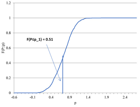 Taking for the measure “Partial compensation of remuneration” as an example, one can note that the sampling distribution was close to the normal one (Figure 2). The curve represents the empirical cumulative distribution function (ECDF). The vertical line indicates the estimate of based on the expert survey (Table 4). The value of the CDF at the latter point indicates the proportion of the Monte Carlo values lower or equal to the expert-based estimate. In our case, the ECDF equaled 0.51 (which is close to 0.5) at the expert-based estimate. This suggests that the utility score based on the expert ratings was close to the median value—at which —of the utility scores rendered by the Monte Carlo simulation where the weights of criteria of agricultural resilience were completely unknown. Therefore, the expert ratings seemed to have little deviation from the random weighting.