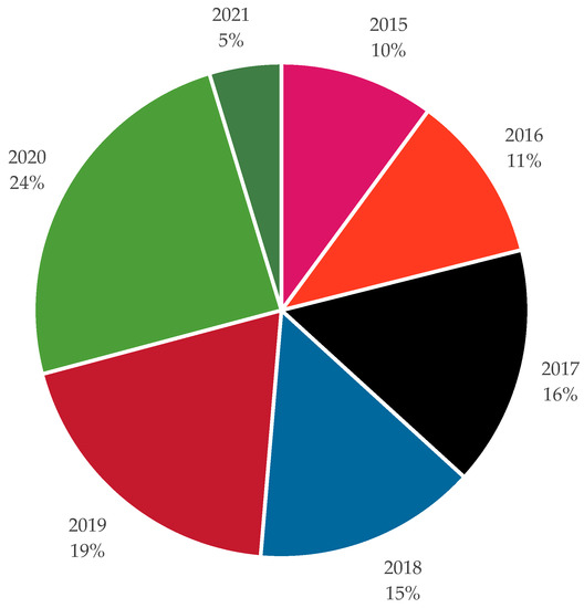 The proportion of papers published between January 2015 and March 2021 (general search: “Sustainability”, “Agenda 2030”, “Millennium Development Goals”, and “physical education”).