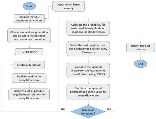 GSO is assumed as an intelligence swarm optimized technique utilized for speeding up the luminescent feature of fireflies. This GSO technique has shared the glowworm swarm from the space solution and FF of all glowworm places [19]. The strong glowworm was higher brightness, and an optimal place was developed for maximum FF rate. The glowworm was conceived of the dynamic line of sight, for instance, the decision domain, the range of density for neighboring nodes. Conversely, the decision radius has been constrained if the glowworm travels near a similar type of robust fluorescence from the decision domain. Obtaining the maximum value of iterations, every glowworm is placed from a better place. The process contained from the GSO techniques is demonstrated in Figure 4 [43].