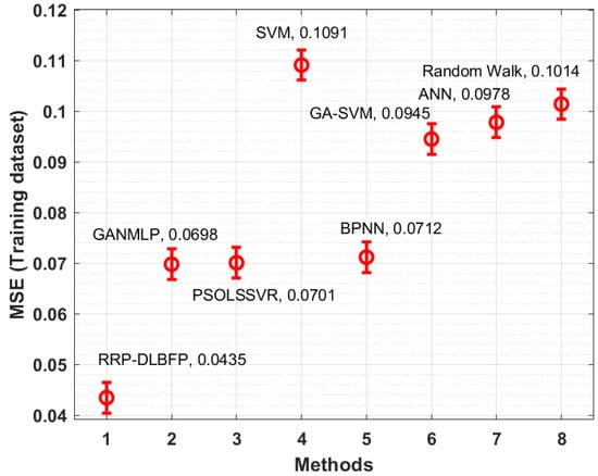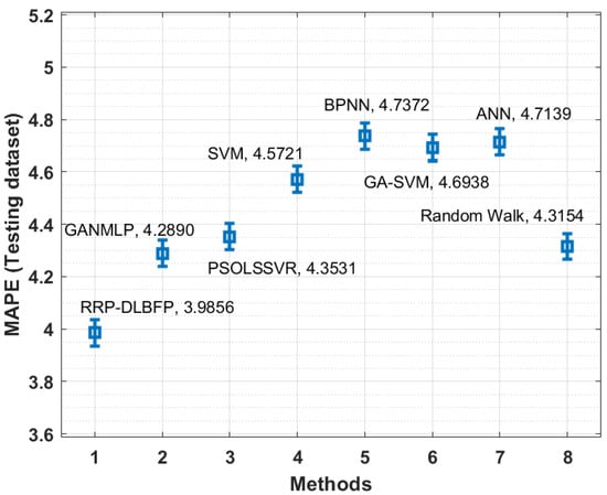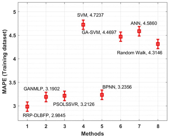 Figure 6 illustrates the MAPE analysis of the RRP-DLBFP manner under the applied training set. The figure demonstrated that the SVM, GA-SVM, ANN, and Random walk approaches have resulted in an unsuccessful outcome with a maximum MAPE of 4.7237, 4.4697, 4.5860, and 4.3146. Likewise, the PSOLSSVR and BPNN techniques have gained somewhat optimum performance with the MAPE of 3.2356 and 3.2126, correspondingly. Similarly, the GANMLP technique has accomplished a moderately reasonable MAPE of 3.1902. Lastly, the RRP-DLBFP methodology has attained an effective outcome with a minimum MAPE of 2.9845.