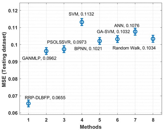 Figure 7 depicts the MSE analysis of the RRP-DLBFP approach under the applied testing set. The figure exhibited that the SVM, GA-SVM, ANN, and Random walk techniques have resulted in a worse outcome with the superior MSE of 0.1132, 0.1032, 0.1076, and 0.1034, respectively. The BPNN and PSOLSSVR techniques have achieved somewhat better performance with the MSE of 0.1021 and 0.0973, correspondingly. In addtion, the GANMLP algorithm has accomplished a moderately reasonable MSE of 0.0962; but, the RRP-DLBFP methodology reached an effective outcome with a lower MSE of 0.0655.