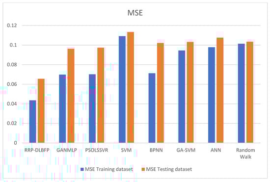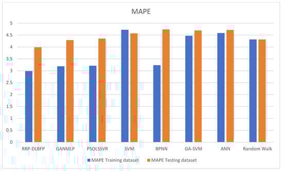 Figure 8 demonstrates the MAPE analysis of the RRP-DLBFP manner under the applied testing set. The results outperformed that the SVM, BPNN, GA-SVM, and ANN approaches resulting in ineffective outcomes with a higher MAPE of 4.5721, 4.7372, 4.6938, and 4.7139. Along with that, the Random walk and PSOLSSVR techniques have obtained slightly optimum performance with the MAPE of 4.3154 and 4.3531, correspondingly. Next, the GANMLP methodology accomplished a moderately reasonable MAPE of 4.2890. Finally, the RRP-DLBFP approach has obtained effective results with a lesser MAPE of 3.9856. Findings for all models in training and testing are shown in Figure 9 and Figure 10, which combine all MSE and MAPE results into one graph.