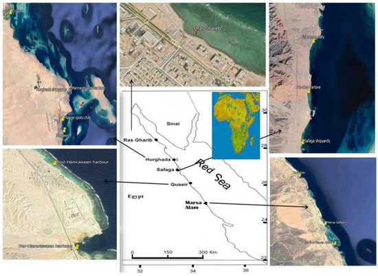 The Red Sea’s coastal and marine resources contribute to Egypt’s food, energy, oil (exploration and production), and tourism industry. In recent years, the quality and protection of natural ecosystems has become a major concern, especially in the coastal and marine areas, where growing population and anthropogenic activities have put a stress on a wide range of natural systems [,]. Tourism, shipping activities, oil extraction, harbours, and fishing practices are all examples of environmental threats to the Red Sea ecosystem [,,,].