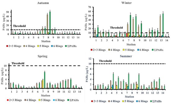 The mean concentration of individual PAHs, including carcinogenic and noncarcinogenic PAHs, in all samples ranged from ND to 1.00 μg/L, ND to 2.68 μg/L, ND to 8.04 μg/L, and ND to 2.18 μg/L, over the summer, autumn, winter, and spring seasons, respectively. Individual PAHs levels are either within or beyond the European Water Framework Directive’s (WFD) Annual Average Environmental Quality Standards (AA-EQS), which indicate that the permissible range for PAHs is 0.002 to 2.4 µg/L [].