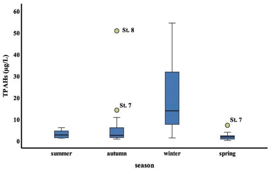 The highest average level of individual PAHs measured in seawater samples was chrysene (1.00, 1.92, 8.04 and 1.31 μg/L) in the summer, autumn, winter and spring season, respectively. This high chrysene concentration may be due to its low water solubility, which allows it to be adsorbed onto particulate matter’s surface, and also its high resistance to degradation. Our findings agree with those of [], who discovered that the amount of chrysene did not shift significantly after 12 years of oil spill, suggesting the chrysene is difficult to degrade by to the aquatic ecosystem than other compounds.