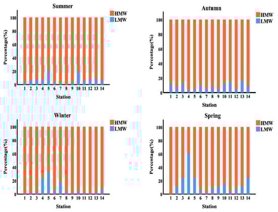 Pyrogenic sources were found to be depleted in low molecular weight 2–3 rings PAHs (LMW) and enriched in high molecular weight 4–6 rings PAHs (HMW), resulting in LMW/HMW ratios of less than one. LMW-PAHs predominated in petrogenic sources such as light refined petroleum products or fuel oil with an LMW/HMW > 1 ratio [,,]. The LMW/HMW ratios were less than one in all seasons, with the exception of station 4 in the spring, indicating that they derived from pyrogenic sources.