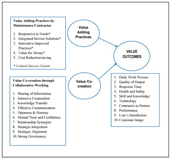 The S-D model emphasized the importance of value co-creation, where service systems such as people, information, and technology engage with other service systems for adaptability and survival [29]. Value is co-created jointly or reciprocally among the provider/producer and the consumer or beneficiaries, through physical and tangible resources [29]. Value co-creation is also defined as “the joint, collaborative, concurrent, peer-like process of producing new value, both materially and symbolically” [56]. The business focus should be shifted to co-create unique value with customers rather than the traditional company-centric value creation [57]. Grönroos and Voima [58] suggested a “joint sphere” where value is co-created when service providers and customers interact jointly, directly or indirectly. Malaysian public hospitals currently rely on a fee deduction system to ensure conformance and performance [10], which drains the manpower in contractor supervision and monitoring [10] when hospitals are already reported to be under-staff [59]. Improvement in the collaborative working environment rather than a punitive system could potentially help to enhance service delivery. Previous studies shown that collaborative working improved the construction supply chain [60] and infrastructure asset maintenance [61]. Past literature acknowledged that value co-creation could be achieved through intensive cooperation [51], sharing of information [29], knowledge transfer [29,30] and effective communication [51]. Additionally, openness and honesty; mutual trust and confidence [25] and relationship synergies [26], strategic alignment [30], strategic integration [27], and strong governance [25] were also explored as value co-creation factors. Hence, it is postulated that value co-creation practices can potentially improve the delivery of maintenance service to hospitals, therefore enhancing the value outcomes.