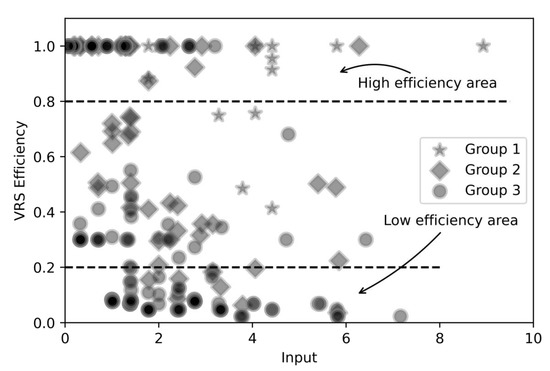 The primary aims of efficiency and performance analysis of education were the feedback to the students. By ranking the output grades, three groups (outputs ≧ 10, 10 > outputs ≧ 5, and 5 > outputs) were clustered. The mean test of input and efficiency by t-test and analysis of variance (ANOVA) is shown in Table 7. The result showed that the differences among groups 1 to 3 are significant. Figure 3 shows the diagram of the inputs and VRS efficiency of different groups. In particular, the result showed that group 1 has a higher input and efficiency. Although in groups 2 and 3, the input of some students (n = 20, 8.4% of samples) is high (>4), their efficiency is notably low.