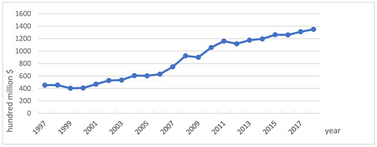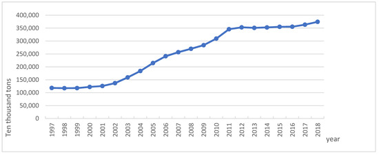 Figure 2 shows the trend of China’s total carbon dioxide emissions from 1997 to 2018. During the study period, the total amount of carbon dioxide emissions in China increased significantly, from 1182.9 million tons in 1997 to 3744.16 million tons in 2018. This is illustrated in Figure 3. This process can be divided into two stages, before and after China’s accession to the World Trade Organization (WTO) in 2001. The growth of carbon emissions was slow prior to China’s accession to the WTO. Following China’s accession to the WTO in 2001, with the deepening of China’s economic opening up, the growth rate of carbon emissions also accelerated. As an increase of about 173% was noted, from 1369.61 million tons in 2002 to 3744.16 million tons in 2018, it can be argued that to some extent China’s carbon emissions since 1997, especially since 2002, tend to be consistent with the changes in the degree of opening up.