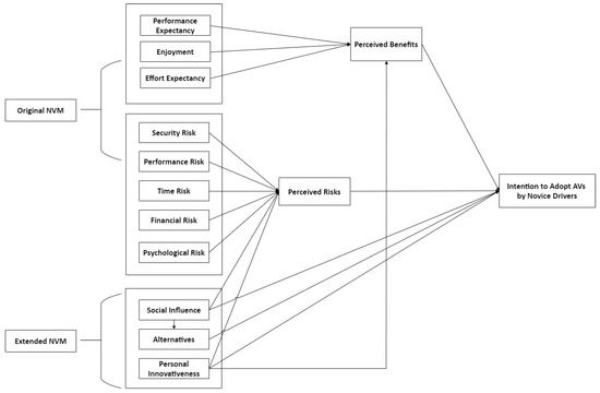 This study proposed a theoretical model by extending the original NVM to predict the individual’s intentions to drive AVs. The model presented in Figure 2 suggests that an individual’s intention to drive an AV is supported by their perception of the benefits and hindered by their perception of the risks connected with its use.