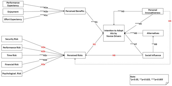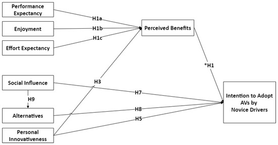 The outcomes of this research also revealed a direct link between the intent to adopt AVs and three new constructs: alternatives (H8), social influence (H7), and personal innovativeness (H3, H5). The impact of these constructs on individuals’ intention to adopt AVs has largely been ignored [1,3,10].